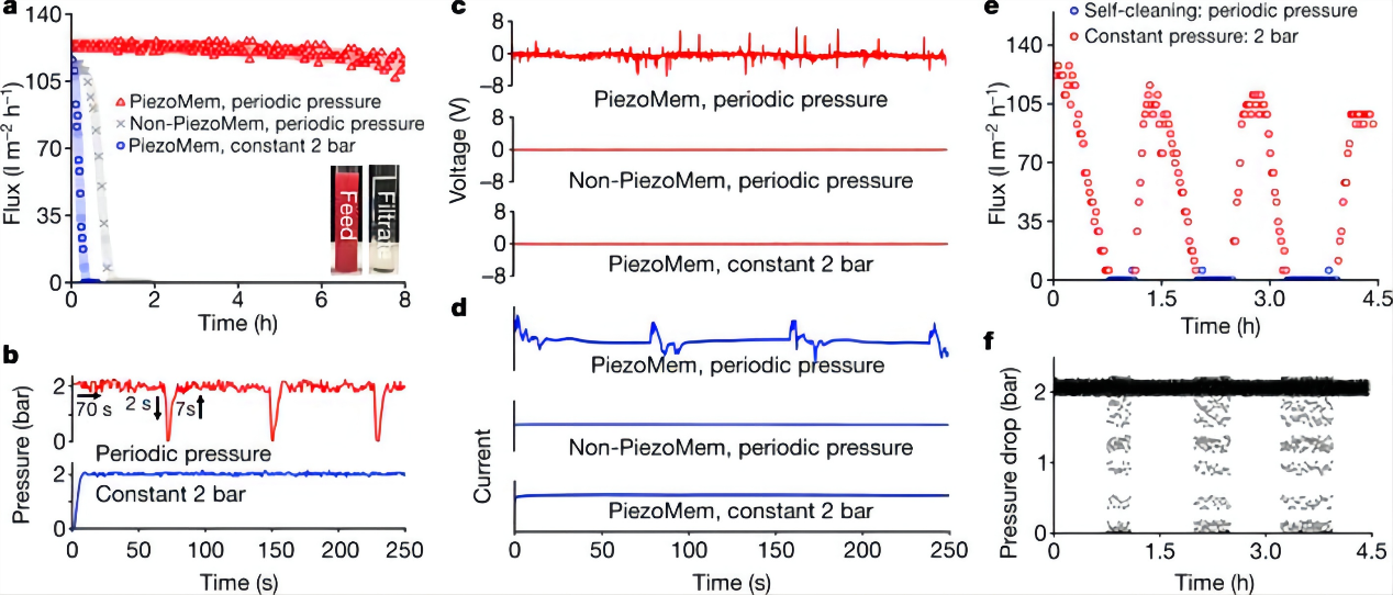 In summary, the pressure pulse generated piezopotential enabled an in-situ real-time self-cleaning membrane without need for supplementary chemical cleaning agents, secondary waste disposal, or additional external stimuli equipment. Furthermore, the pressure stimuli responsive antifouling strategy demonstrated here has potential for a vast breadth of applications from household and medical sanitation (ceramic toilet, washing machine, or catheter tubing) and industrial equipment (seagoing vessels, fluid pipelines, or separation membranes) that commonly interact with hydraulic pressure fluctuations. So the strategy to utilize the inherent hydraulic pressure as a driving force to generate in situ electroactivity is a pioneering concept for achieving novel functional materials with potential antifouling, anticorrosion, and/or disinfection properties.