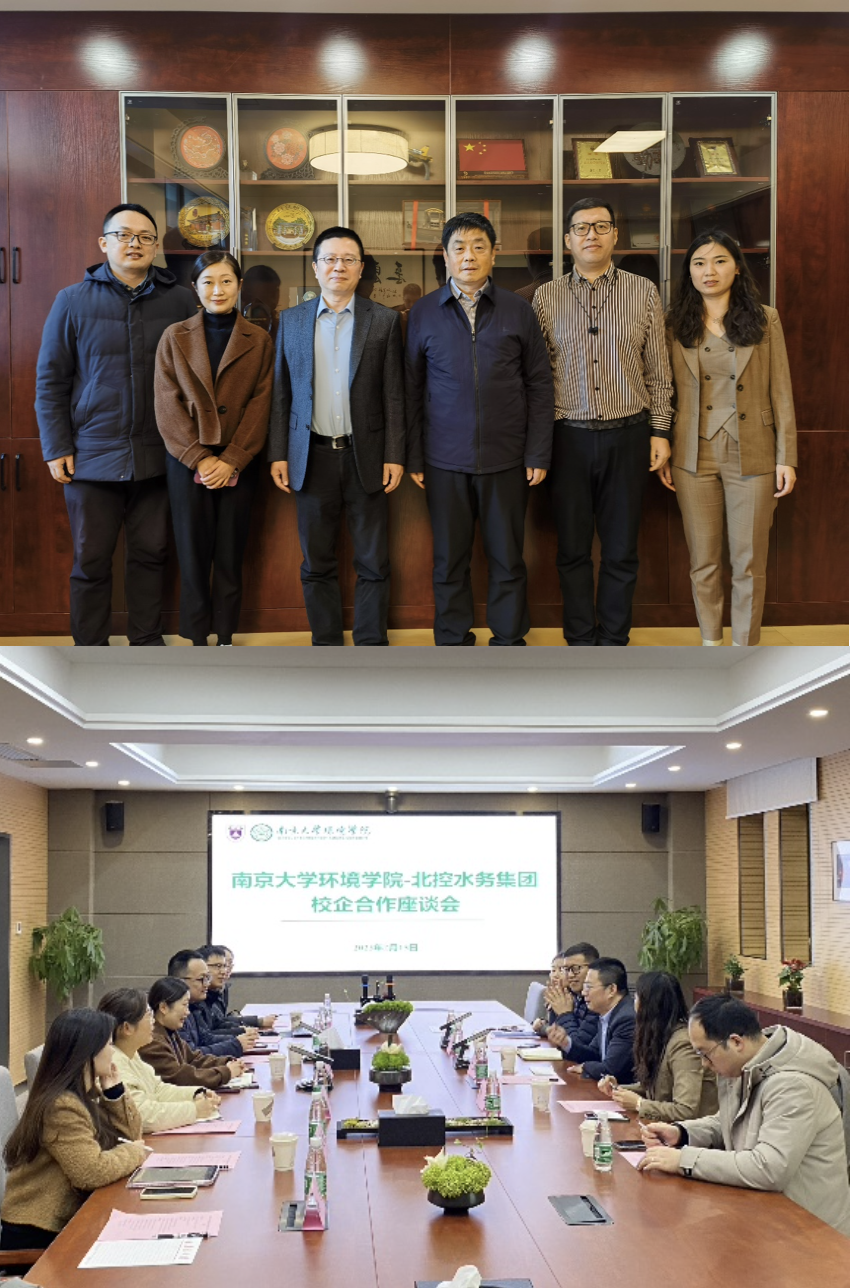 On the afternoon of February 15, 2023, Liguo Yu, Senior Vice President of Beijing Water Group, Guangpeng Ji, deputy general manager of Beishui Education Center, Lan Yang, deputy general manager of Nanjing Regional Company of Eastern Region, and other people visited our school. Hongqiang Ren, Academician of the Chinese Academy of Engineering and dean of School of Environment, Yuan Zhou, deputy secretary of Party Committee of school, Qing Zhou, deputy dean of school, and representatives of teachers faculties and students had an in-depth exchange on school-enterprise cooperation with Beijing Water Group.