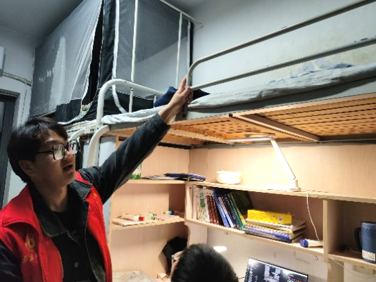 在检查过程中,辅导员和志愿者们对床铺护栏高度、扶梯稳固情况、宿舍用电安全、消防安全等方面进行全方位排查,经检查发现,同学们普遍能够遵守宿舍安全管理规定,自觉营造安全温馨的生活环境,但个别宿舍存在学生床位护栏、爬梯等部件存在松动、上层床位床垫较厚、宿舍无人情况下插线板电源未切断等33处潜在安全隐患,志愿者们将检查结果汇总后上报宿管处,由其安排物业进行维修。