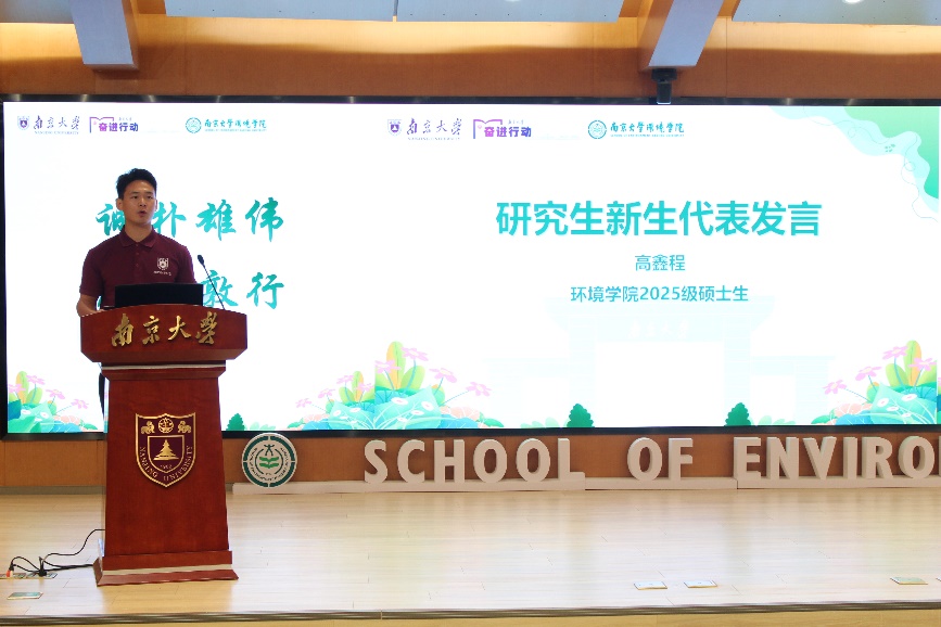 研究生新生代表、2025级硕士生高鑫程结合自身服役经历谈及报效国家、服务人民的初心,表示将继承发扬"诚朴雄伟,励学敦行"的南大精神,将所学知识转化为服务人民、服务社会的实际行动,把个人理想追求融入实现中华民族伟大复兴的奋斗历程。
